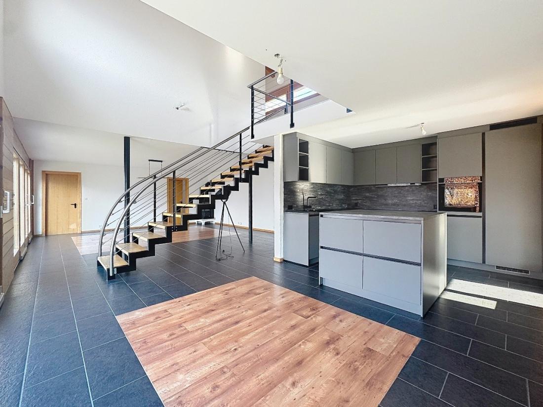 Un escalier design mène au rez-inférieur et à sa magnifique pièce à vivre. Orienté nord-ouest, cet espace offre une belle hauteur sous plafond, une luminosité remarquable et un dégagement sans vis-à-vis. Une annexe entièrement vitrée, faisant office de salle à manger, a été ajoutée afin d’apporter encore plus d’espace et de lumière. Une chambre, un bureau et une salle de douche complètent cet étage.