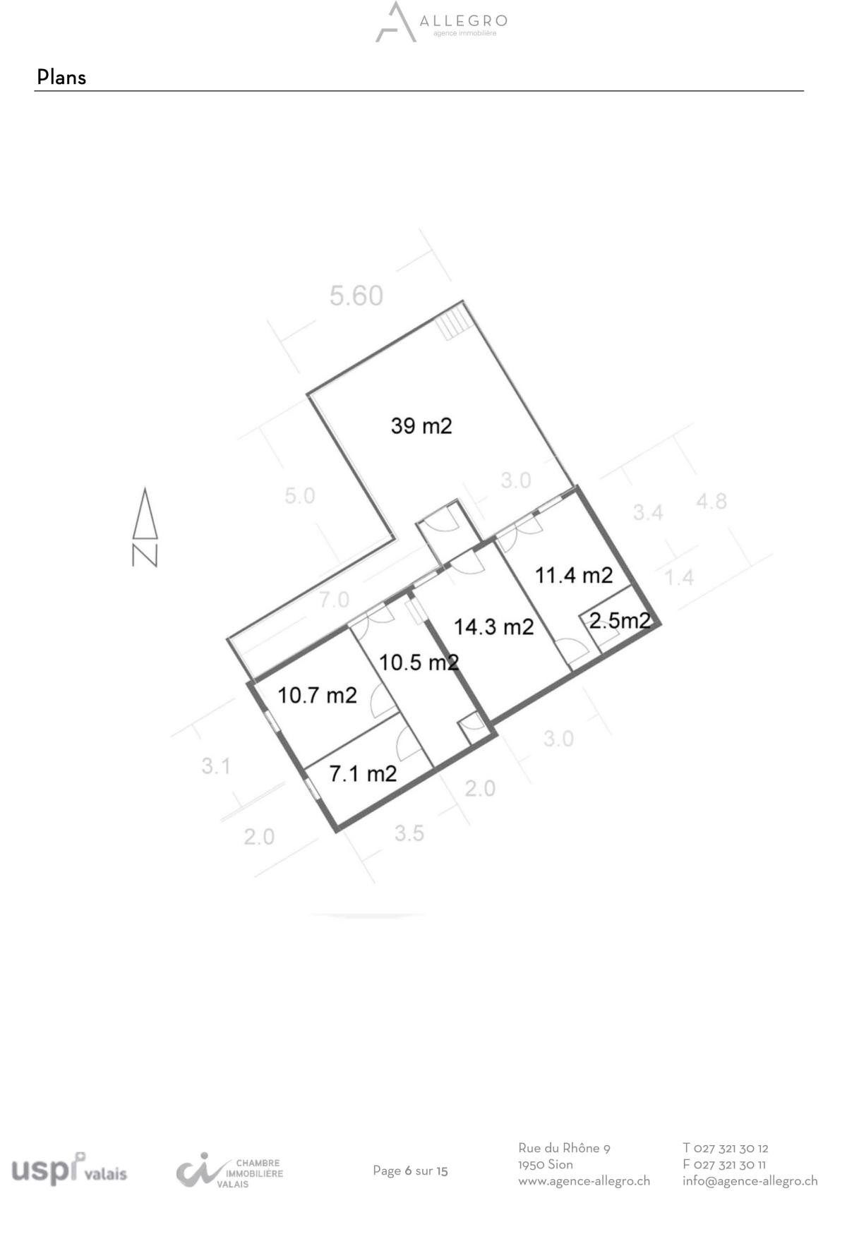 Le bien dispose d’une surface habitable brute de 66 m2, à laquelle s’ajoute une terrasse de 39 m2 (total de la surface de vente pondérée avec 1/3 terrasse = 79 m2). L’appartement s’organise de la manière suivante en considérant les surfaces habitables nettes (=balayables) :