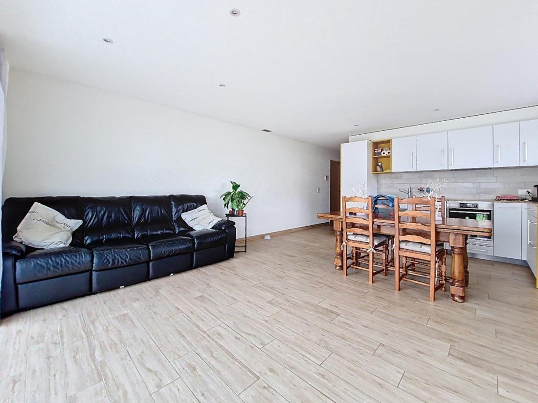 L’appartement dispose d’une surface habitable brute de 76.8 m2, à laquelle s’ajoute une terrasse de 23.6 m2 (total de la surface de vente pondérée avec 1/3 terrasse = 84.7 m2). Il s’organise de la manière suivante en considérant les surfaces habitables nettes (=balayables) :