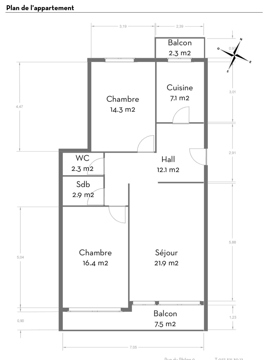 La surface habitable brute s’élève à 86.4 m2, à laquelle s’ajoute les balcons de respectivement 2.3 m2 et 7.5 m2 (total de la surface de vente pondérée avec les 1/2 balcons = 91.4 m2). L’appartement s’organise de la manière suivante en considérant les surfaces habitables nettes (=balayables) :